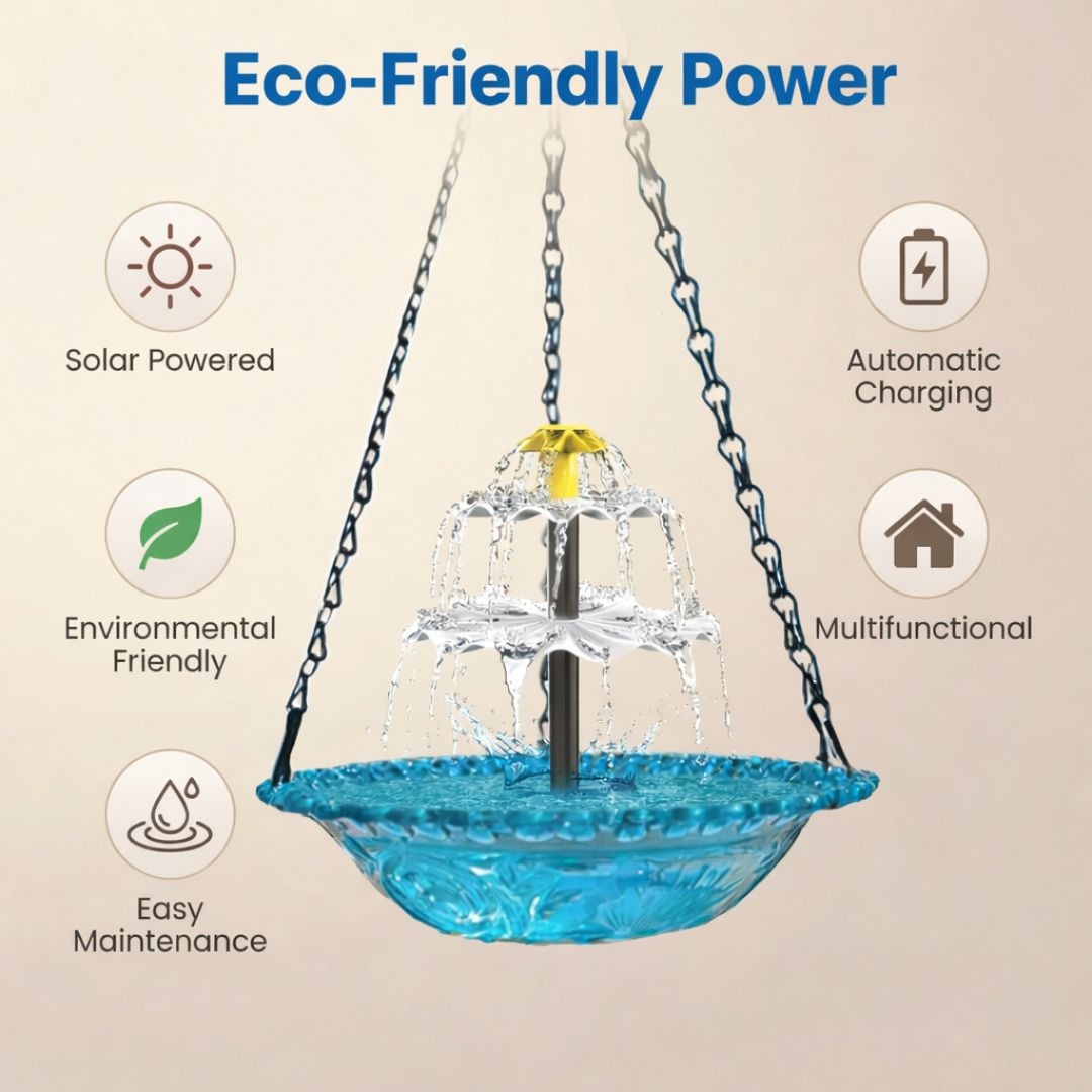 Powered by sunlight, this solar bird bath fountain automatically runs during the day using its built-in solar panel—no wiring or external electricity required. The dual-tier cascading design circulates water continuously, helping attract birds while adding movement to your garden. Easy to hang and simple to maintain, it charges in direct sunlight and operates automatically. Designed for outdoor use, it offers an eco-friendly way to create a lively and refreshing backyard atmosphere.