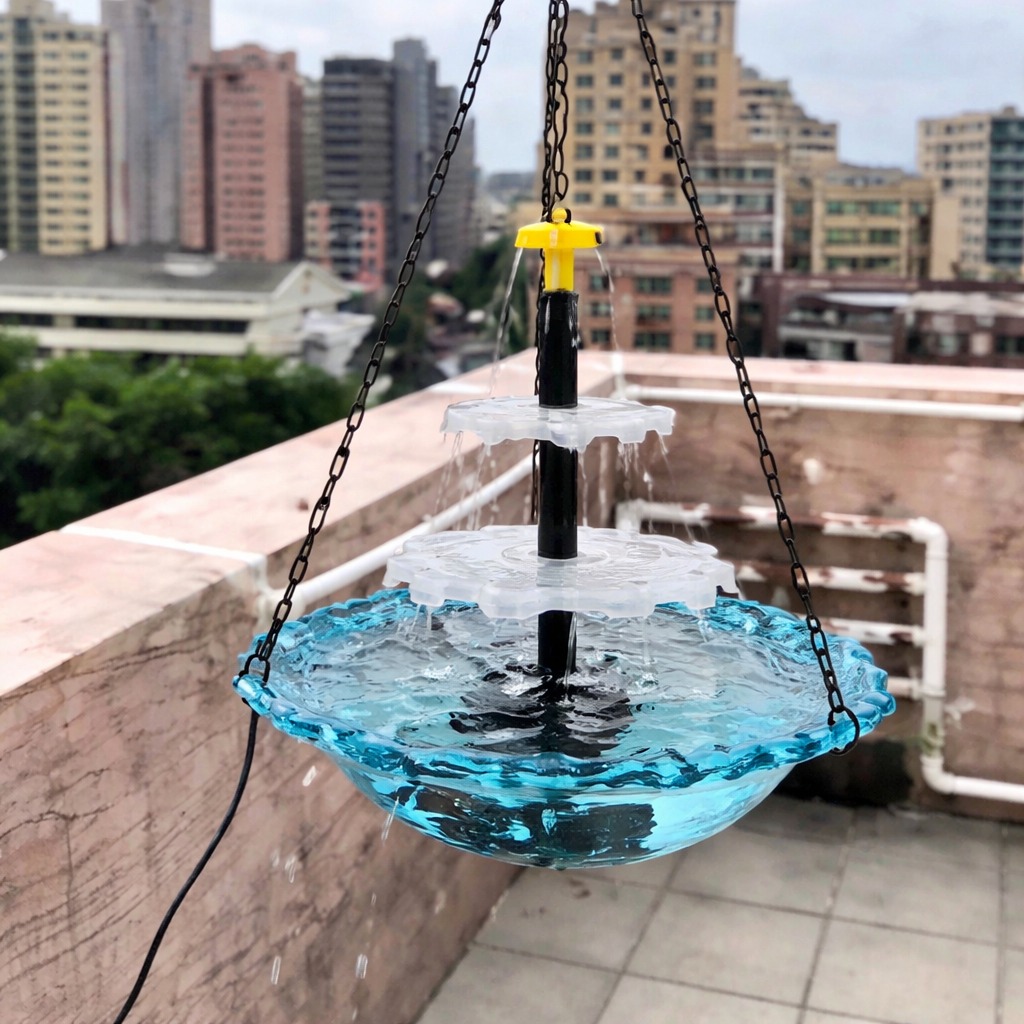 Bathed in warm sunlight, this solar-powered hanging fountain creates a gentle cascade that sparkles beautifully in your garden. The vibrant blue bowl and tiered design add movement and charm, attracting birds while bringing a peaceful, refreshing atmosphere to any outdoor space.